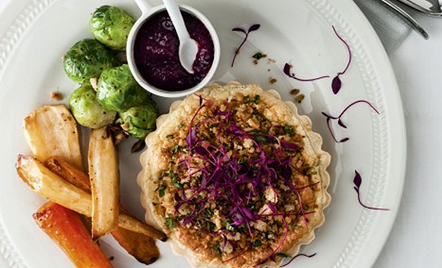 Vegetable and truffle tart with Jerusalem artichokes, sweet potatoes and a crumb topping works well with the vegetarian Christmas trimmings.